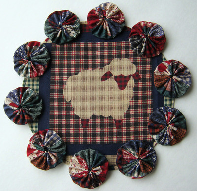 Title (ebay affiliate link): Patchwork Sheep Ewe Quilt Look Country Gingham YoYo Candle Mat Doily Centerpiece