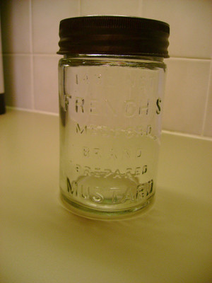 antique mustard jar embossed."French's Mustard" pint size jar with original lid