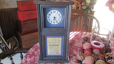 Title (ebay affiliate link): TALL COUNTRY PRIMITIVE MANTEL OR WALL CLOCK W/STITCHED SAMPLER UNDER GLASS