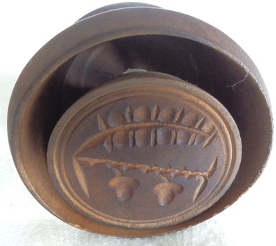 Title (ebay affiliate link): Primitive Antique Butter Mold Press Stamp Acorns and Plant