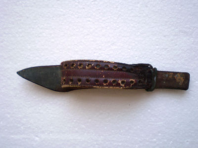 Title (ebay affiliate link): Primitive Antique Hand Made Metal Leather Farming Tool Corn Husker ?