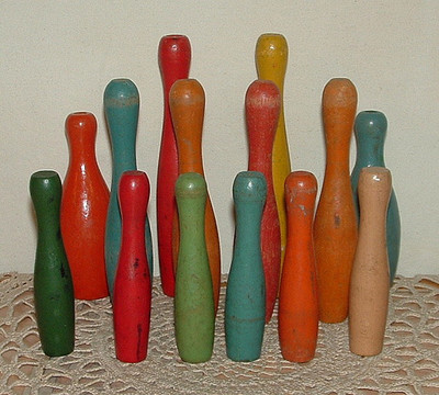 Title (ebay affiliate link): 14 Vintage Old Antique Wooden Toy Bowling Pins Original Paint Wood Lot #10 NR