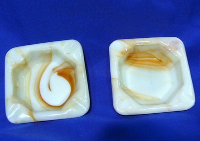 Title (ebay affiliate link): VINTAGE PAIR AKRO AGATE MARBLE CO. 3" ASHTRAYS CORKSCREW SLAG GLASS FLOURESES