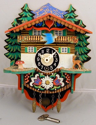 Title (ebay affiliate link): Vintage Engstler Wind-Up Wall Clock, Bluebird moves w/ Pendulum, Germany