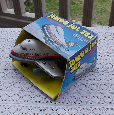 Title (ebay affiliate link): Vintage Tin Friction Toy Jumbo Jet A4A Boeing 747 & Original Box KF 2927A Plane