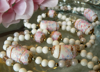ART DECO VTG PINK BLUE GOLD WEDDING CAKE LAMPWORK ART MILK GLASS BEAD NECKLACE!!