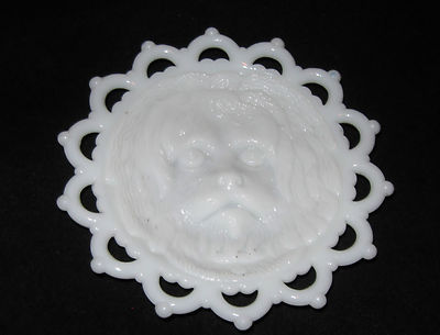 Title (ebay affiliate link): MILK GLASS PLAQUE, OPEN LOOP AROUND EDGE, DOG FACE IN MIDDLE