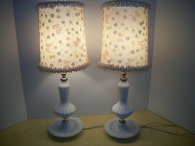 Title (ebay affiliate link): Vintage Chic Pair White milk glass swirl Electric Lamps Shabby ruffled shades
