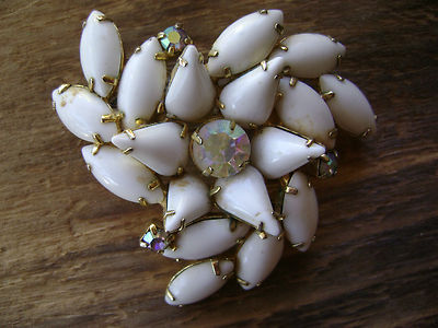 VINTAGE MILK GLASS AND RHINESTONE BROOCH