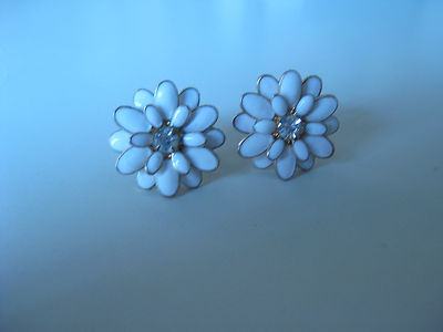 CUTE Vintage white milk glass color enamel flower SCREW EARRINGS -