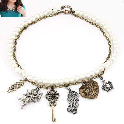 Fashion Retro Jewelry Pearl Bronze Necklace Key Heart Leaf Vintage Pendant Chain