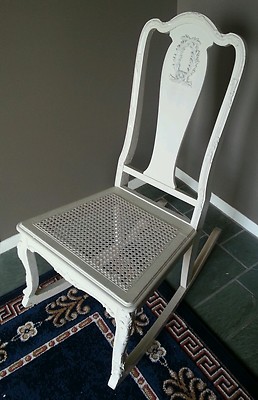 Title (ebay affiliate link): Vintage Caned Sewing Rocker Antique Ornate Painted Off White