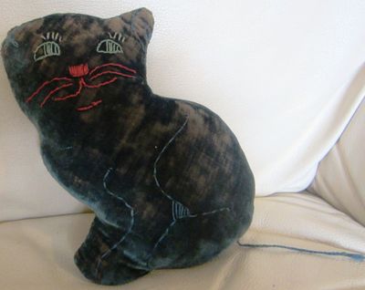 Vintage folk art velvet cat hand stitched old antique kitten pillow green velvet