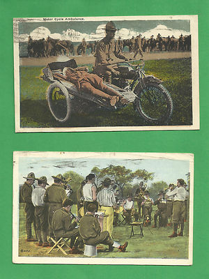 2 card lot/military/Army/motor cycle ambulance & servicemen playing flutes/horns