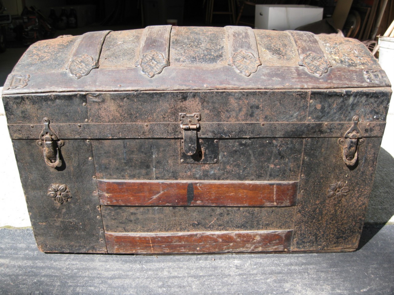 Title (ebay affiliate link): Small Antique Dome Steamer Trunk Metal Wood Oak Slats