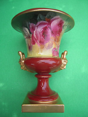 Title (ebay affiliate link): 19C. Campana Form Porcelain Urn Vase HP Pink Roses Gilt Mask Handles Excellent