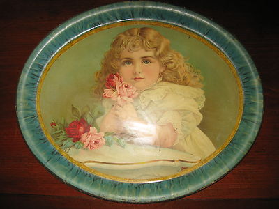 ANTIQUE HANDPAINTED METAL OVAL TRAY BEAUTIFUL GIRL 16.5" x 13.5"