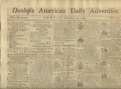 Title (ebay affiliate link): Early American paper 1792 "DUNLAP'S AMERICAN DAILY ADVERTISER" Nov. 19, 1792