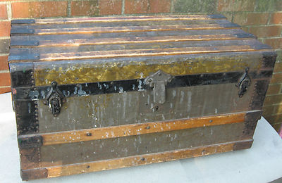 Title (ebay affiliate link): ANTIQUE WOOD SLAT FLAT TOP SMALL STEAMER TRUNK CHEST WHEELED METAL