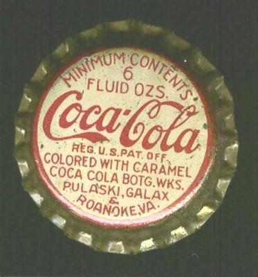 1930s UNUSED COCA COLA SODA BOTTLE CAP from ROANOKE, VIRGINIA