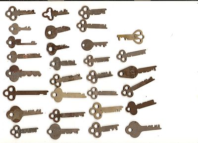 Title (ebay affiliate link): 30 ANTIQUE keys Skeleton Padlock Flat Cabinet Vintage Key SET Old deco