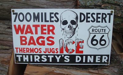 Title (ebay affiliate link): Thirsty's Diner Route 66 Vintage Ande Rooney Enameled Porcelain Sign Americana