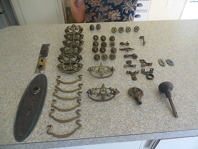 Title (ebay affiliate link): Lot of 46 Antique Brass Furniture Hardware Knobs Pulls Hinges Keyhole Covers NR!