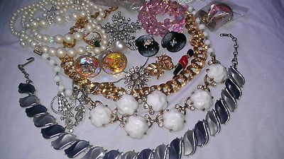 Vintage Jewelry costume lot rhinestones necklaces earrings milk glass trifari