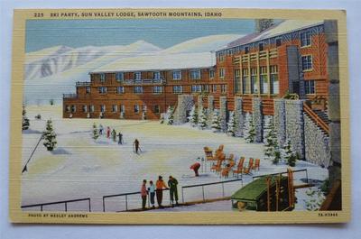 Title (ebay affiliate link): Postcard Idaho SUN VALLEY Ski Party Lodge Sawtooth Moutains Linen Wesley Andrews