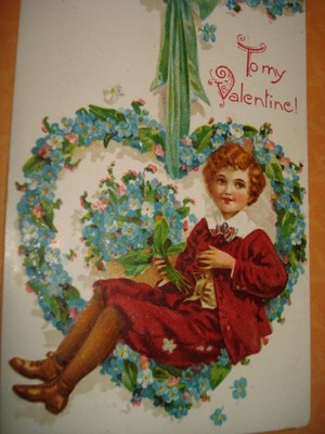 Title (ebay affiliate link): Vintage OLD Valentine postcard Boy sitting in Floral Heart Forget me nots ribbon