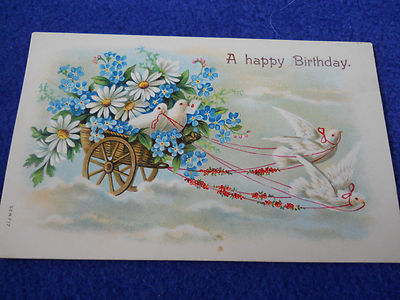 Vintage Used Birthday Postcard Embossed Flowers Cart/Wagon Doves