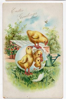 Title (ebay affiliate link): Antique Easter Post Card 4 Chicks from one Egg ? R&S Trademark unused