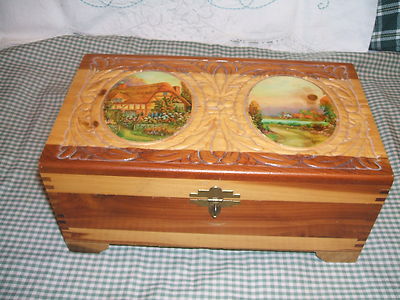 Title (ebay affiliate link): PRETTIE VTG WOOD CARVED CEDAR WOOD JEWELRY/TRINKET BOX*MIRROR*COTTAGE SCENES*
