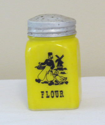 VTG Antique Yellow White Milk Glass Square Flour Shaker Silver Tin Aluminum Lid