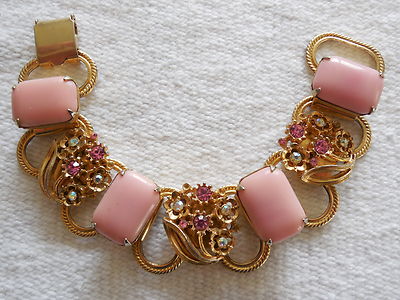 Title (ebay affiliate link): Lovely Vintage Pink Milkglass Cabochon Rhinestone Flower Bracelet, Exc!