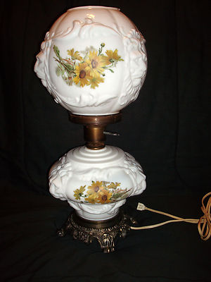 Title (ebay affiliate link): Vintage GWTW Hurricane Milk Glass Lion Head Yellow Floral Parlor Electric Lamp