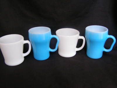 Title (ebay affiliate link): 4 Vintage Fire King Anchor Hocking Coffee/Soda Mugs Bright Blue & Milk White