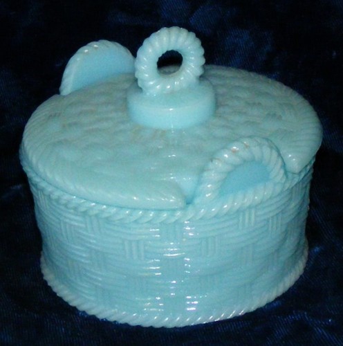 Title (ebay affiliate link): VALLERYSTHAL PV Blue Basket Weave 1900 Lidded Box Blue Milk Glass