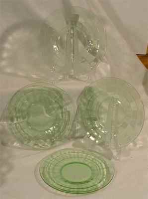 Title (ebay affiliate link): DEPRESSION GLASS -4 GREEN BLOCK OPTIC SHERBET PLATES 6"