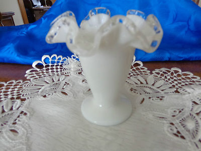 Vintage Fenton Silver Crest Milk White Clear Ruffled Edge 4" Vase