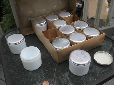 Title (ebay affiliate link): VINTAGE 12 WHITE/MILK GLASS JARS/POTS WITH LIDS 2 OZ NO 43 OINT POTS