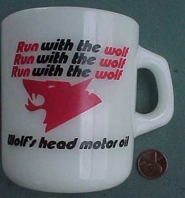 Title (ebay affiliate link): 1960s Tampa Bay Florida Wolf's Head Motor Oil Galaxy Milkglass coffee mug or cup