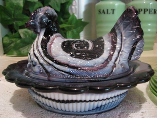 AMETHYST - BLUE & MILK SLAG Glass HEN CHICKEN on NEST