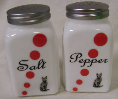 Milk Glass Salt & Pepper Shaker Set w/ Red Dots & Cats