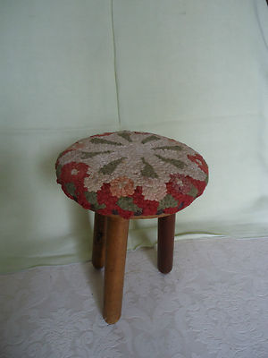 Title (ebay affiliate link): Antique Three Legged MILKING STOOL Hooked Rug Top & Broom Handle Legs