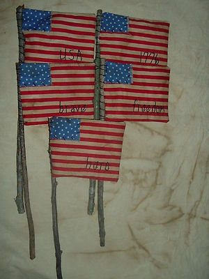 Title (ebay affiliate link): 5 Primitive bowl fillers-AMERICANA FLAGS ON STICKS/STITICHED WORDS