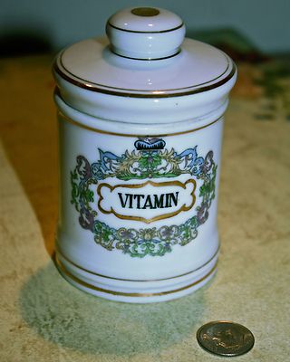 Title (ebay affiliate link): Vintage 1950s Porcelain Apothecary Vitamin Jar with Gold Trim