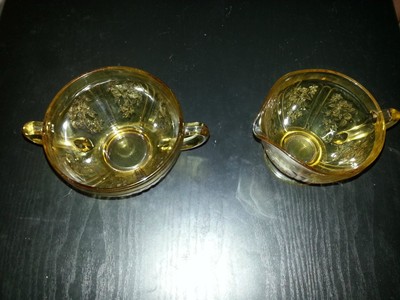 Federal Glass Sharon Cabbage Rose Amber Depression Sugar Bowl and Creamer Yellow