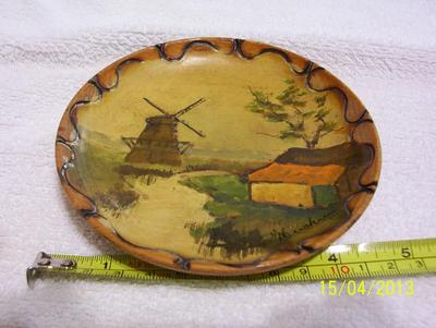 Antique ORIGINAL Wood Plate Windmill Cottage Dutch Oil Painting Wooden SIGNED