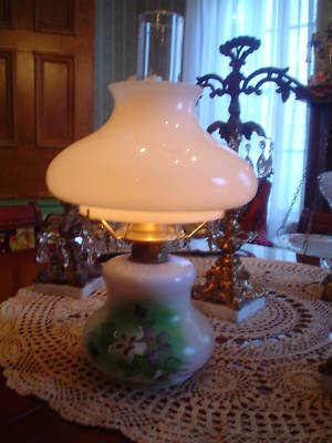 ANTIQUE HAND PAINTED OIL LAMP BASE & MILK GLASS SHADE